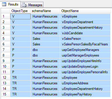 -- http://www.sqldbpros.com SELECT OBJECTPROPERTYEX(sm.object_id, 'basetype') AS ObjectType , OBJECT_SCHEMA_NAME(sm.object_id) AS schemaName , OBJECT_NAME(sm.object_id) AS ObjectName FROM sys.sql_modules AS sm WHERE OBJECTPROPERTY(sm.object_id, 'IsMSShipped') = 0 --exclude system objects AND sm.definition LIKE '%employeeID%'